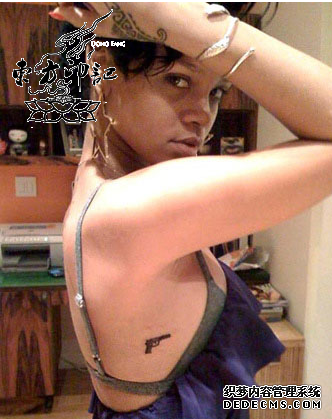 蕾哈娜也是比较野性暴露的一个人物。她的身上也有很多的纹身,最有个性的可以说是右边肋骨处的一个手枪纹身,其实本来这个纹身本来打算纹在腋窝处的,但是由于距离脸部比较近,在代言广告的时候会被拍进去,怕影响,所以改了位置。