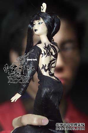 据纹身爱好者透露,在2001年的芭比香港设计展示会上,一款令人耳目一新的叛逆娃娃——纹身摩登芭比横空出世啦,这款“小妇人”芭比娃娃身着晚礼服,裸露的后背上刺着一条醒目的龙纹身,看上去性感、迷人、叛逆。而设计这款纹身芭比的设计者们也的确是要走性感路线:“我希望她看上去性感而神秘。芭比一直都保持着一种非常健康的形象,她应该有另外的一面。”除了这一款“小妇人”的纹身芭比外,天才的设计师们还设计了许多其他的纹身芭比,纹身图案和纹身位置千姿百态。