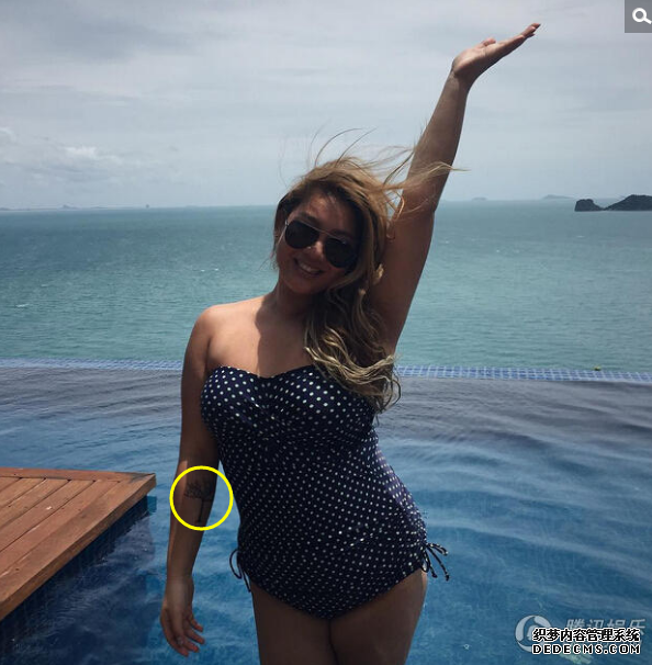 郑欣宜的身材并非目前非常受追捧的纤瘦类型,然而手臂上和胸部添加了纹身的她加上性感的卷发和妆容让她展现出另一种气场。这组纹身写着当中,大部分的纹身都是临时画上去的,可以看出这些纹身都偏向于欧美系列,比如说灯塔纹身、眼睛纹身等。