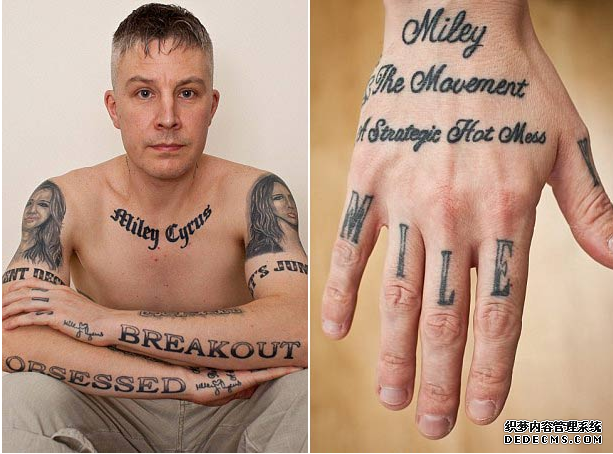 麦莉是美国家喻户晓的歌手和演员,她以的歌曲很好听,但是她的人也很豪迈,经常爆出一些不雅照,大家都习以为常,作风大胆就是她的风格。也许这正是一些男粉丝喜欢她的原因吧,这位42岁的应该卡尔便是其中的忠实粉丝,卡尔不仅是麦莉的忠实粉丝,也是一位纹身爱好者,以至于他在身体上纹了29个麦莉纹身,两侧大臂有麦莉肖像纹身,还有麦莉的名字纹身,麦莉的歌曲纹身。