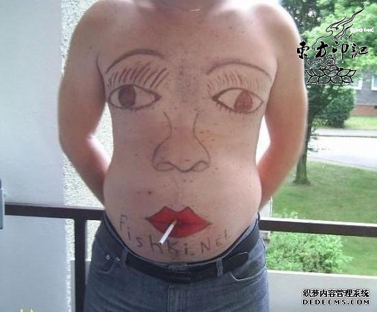 这个胖子的纹身很是通俗易懂,而且还很巧妙地运用了自己特有的身体部位,如果扎眼一看,确实很像一幅美女图,只可惜这样的美女未免太丑了吧:倒长的睫毛、空洞的眼神,肿着的腮帮,再加上鼻子与红唇十万八千里的距离,不过看看人家“嘴巴里”叼着的香烟,就会知道,这是逗君一笑的纹身大作。
