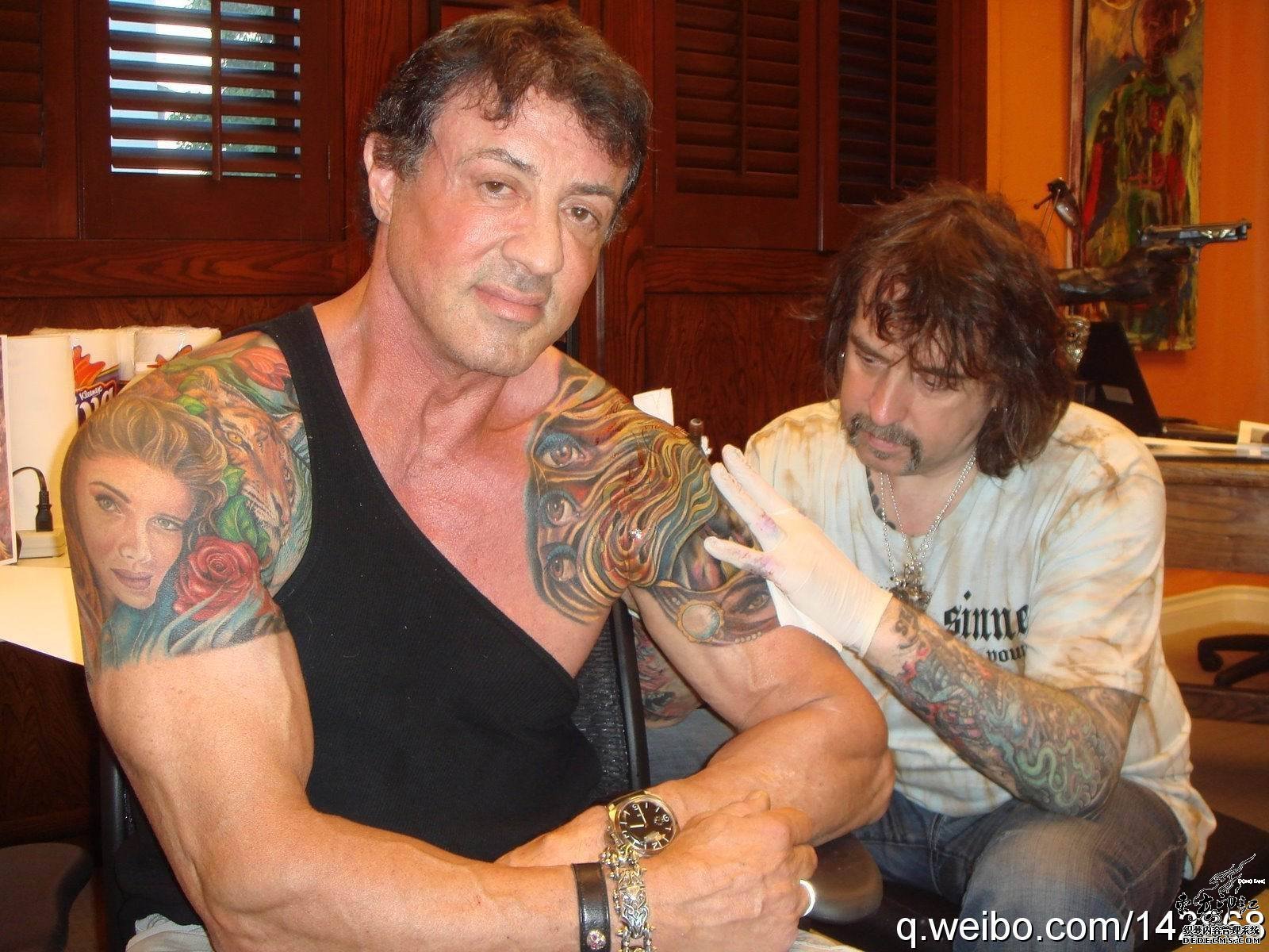在史泰龙的两个肩膀上,有着十分鲜明的半胛纹身,并且两边的纹身图案均被纹成了彩色,最显眼的一处纹身图案莫过于其右臂上的女子头像纹身,这处纹身纹的是史泰龙第三任妻子詹妮弗的画像,在2007年,史泰龙为了庆祝自己结婚十周年,选择了纹身的方式来纪念。紧挨着这个头像纹身的是三朵玫瑰纹身,分别代表着他的三个可爱的女儿,因为每个女儿的的中间名字都是“rose”玫瑰,更逗趣的是,在史泰龙的左胸膛上方还有三只并排着的眼睛,如此醒目的眼睛纹身,或许也是为其孩子而纹的吧。在如此密集的半胛纹身中,唯一一个可以被称为很“man”的纹身图案当属其老虎头像纹身,然而这处纹身被头像纹身和玫瑰纹身所围绕,看起来到有几分滑稽!