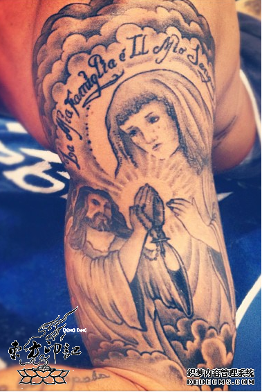 据纹身爱好者透露,拉莫斯左胳膊上的这处纹身图案来自宗教基督教,纹身图案的内容为圣母玛利亚和耶稣的形象,在这个纹身图案的上面还纹有一行意大利字母纹身,纹身的意思为:“我的家庭就是我的血”,因为这个纹身图案位于拉莫斯左臂上侧的位置,远远看去像是一个盔甲!