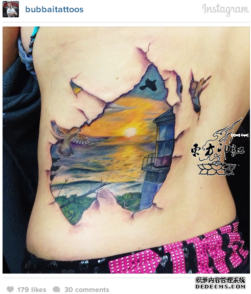 3D风景纹身,有人说风景图是很难画出来立体效果的,要做出具有3D效果的风景纹身,就更不容易了,但是这位纹身控身上的风景纹身很是不一般呀,虽然不能称为是一幅大作,但是这样的风景纹身也很3D啦!