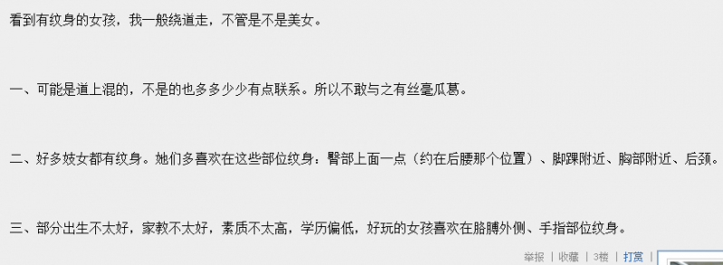 以纹身来判断一个人的好坏本来就是一种错误,更何况这种带有歧视女性的言论,更是让人气愤。希望大家能正视纹身,它只是一种皮肤上的艺术,而不是衡量人品的标志。