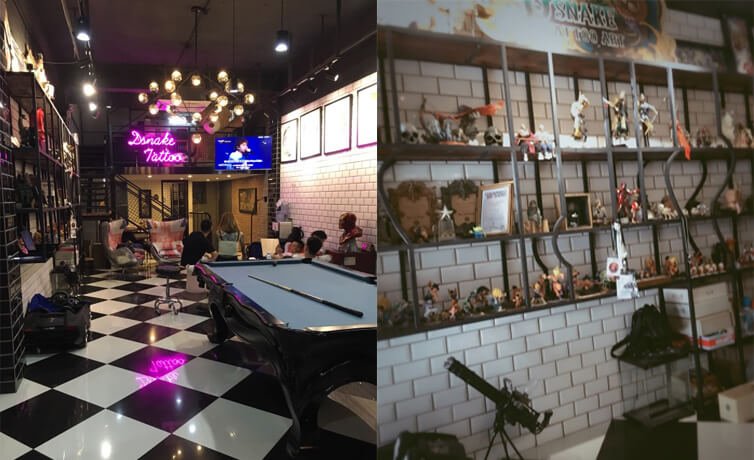 复式两层,店内干净整洁,还有一张桌球桌,在无聊等待的时候可以和朋友,或者是一同来纹身的客人,来一场紧张刺激的桌球比赛。