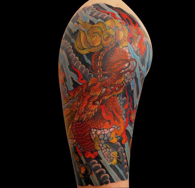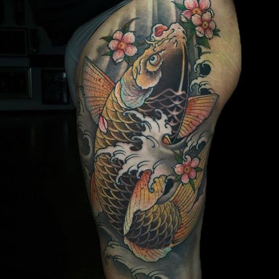 鲤鱼是传统刺青中颇具代表性的纹身图案之一。鲤鱼象征的意义有很多,因为“鱼”与“余”同音,代表会有结余;“鲤”与“利”发音相同,所以也代表着收益和盈利。在风水学来说,鱼可以招财、招福,还可以挡灾、避祸。