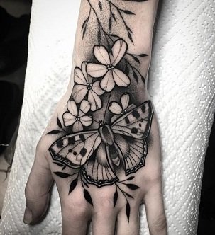 手背黑灰蝴蝶纹身图案