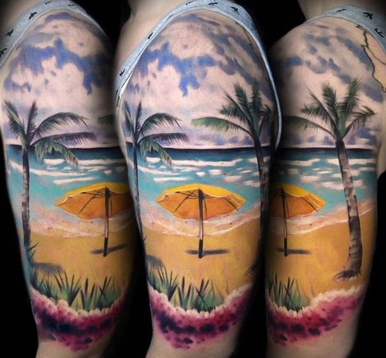 男生手臂上彩绘的海滩风景纹身,你有没有心动呢?