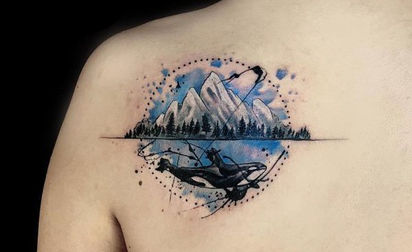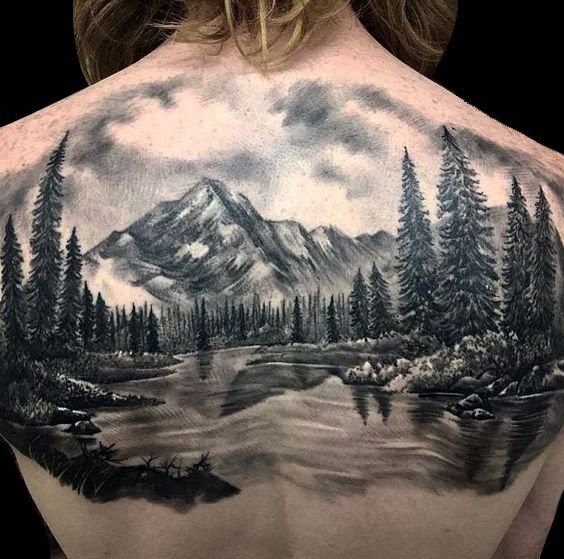 以大面积的山水画为主烦的风景纹身,看起来非常的壮丽。
