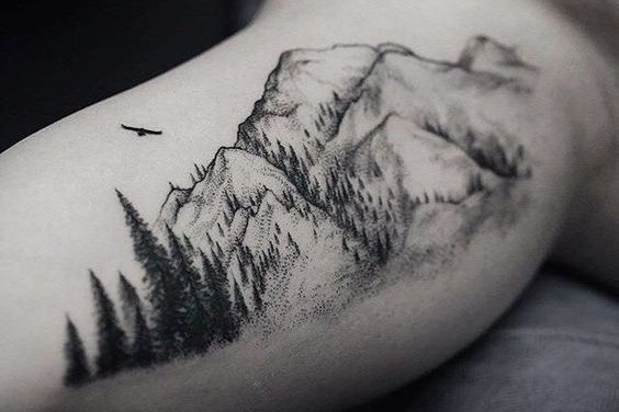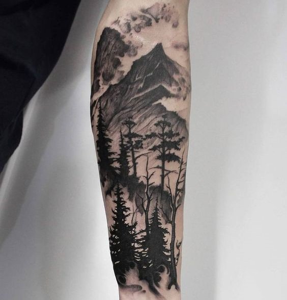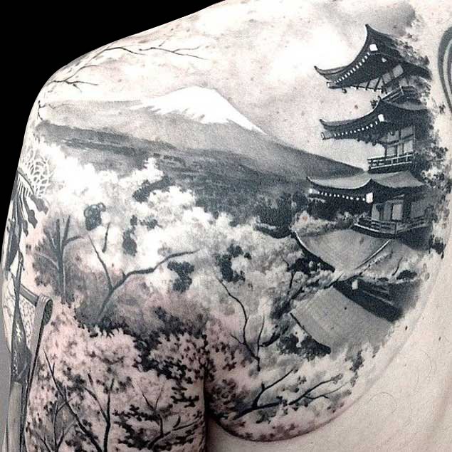 黑灰色调搭配上点刺或是写实的简单设计,将风景纹身的美感展现的淋漓尽致,魅力十足。