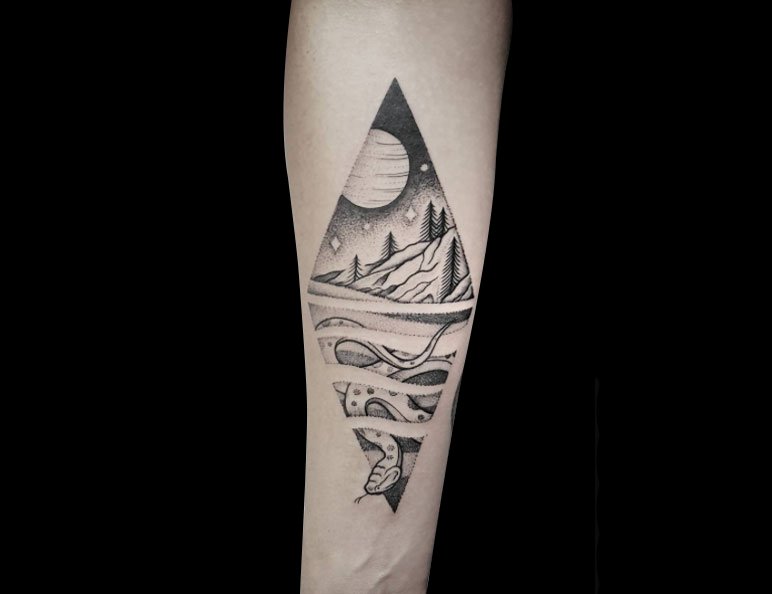月光下一条蛇逶迤前行,几乎就快要冲破皮肤,点刺也能做出逼真的风景纹身呢。