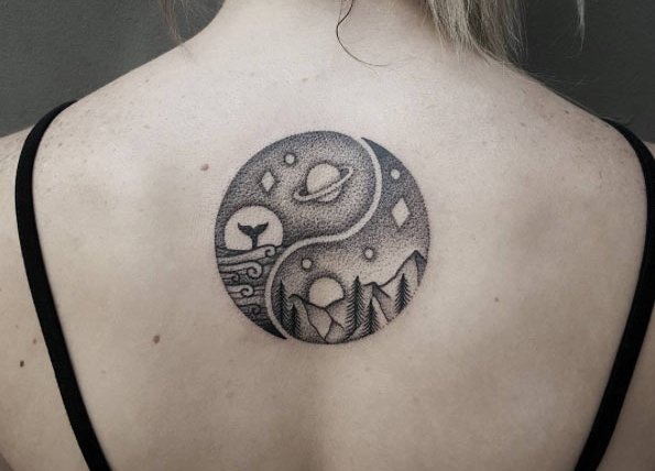 一个阴阳八卦阵创意风景纹身,就将山的那边,海的那边的风景同时塑造出来,十分文艺精致。