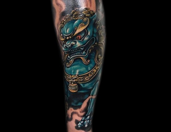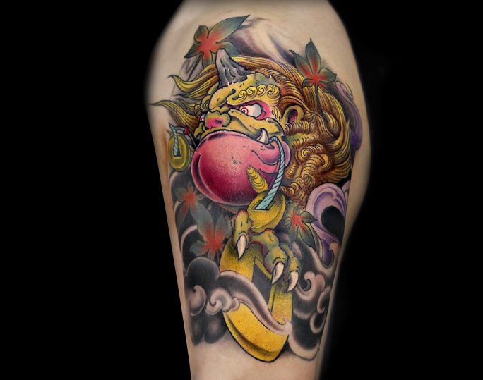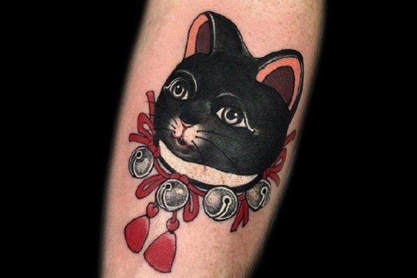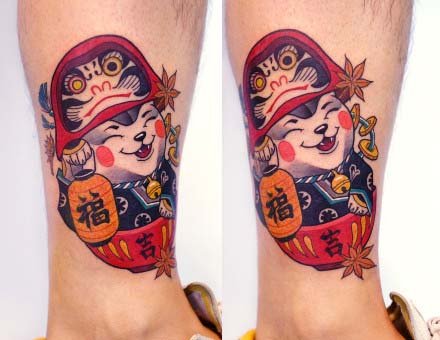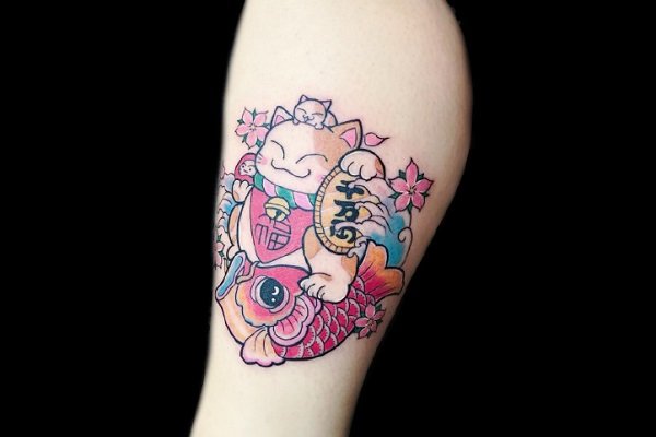 招财纹身:小腿彩色招财猫