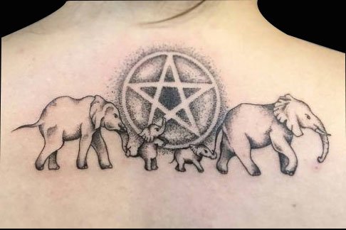 象是群居动物,并且有感情。庞大的身躯加上集体行动,当遇到狮子或鬣狗时,大象会围绕在小象的周围保护它免受攻击。因此有很多人把大象一家或者大象母子纹在身上,象征自己有爱的一家人。