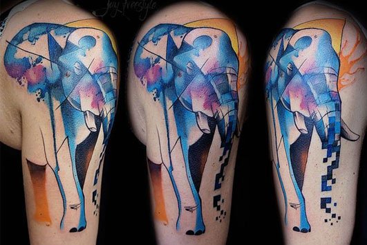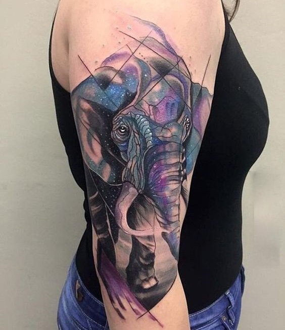 大象和色彩、几何图案的碰撞,很有设计感,构成了自己独一无二的大象纹身。