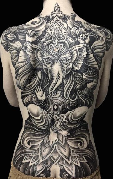 象神是印度非常有人气的一个神,他的形象是象头人身,象征着财运、学问、领导气质,受到很多人崇拜,在纹身界也是非常受欢迎的纹身图案之一。