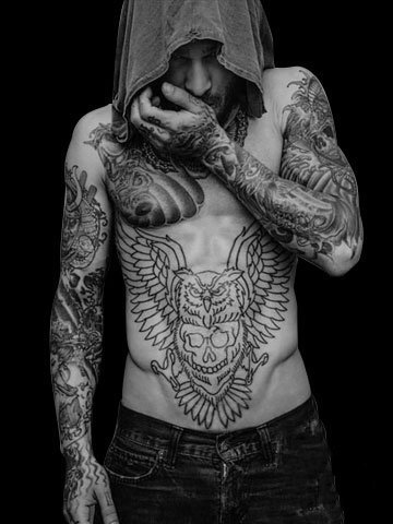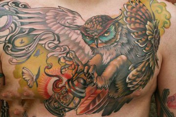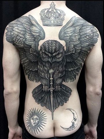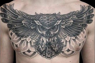 展翅的猫头鹰可以用作大范围的纹身设计,用在胸前或者在后背都是非常好的选择。