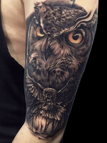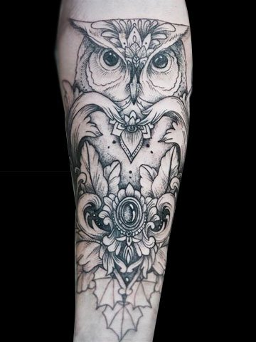 黑灰的猫头鹰纹身适合喜欢酷炫的你,除了羽毛细节的处理,猫头鹰凌厉的眼神也十分考验纹身师功力。
