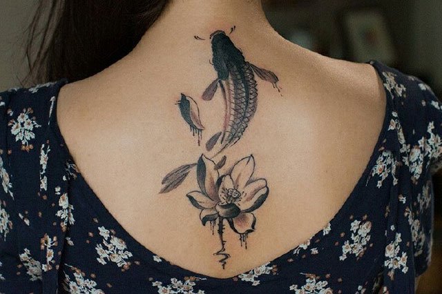 喜欢古典美的话,这款水墨风格的鲤鱼纹身搭配清纯的莲花,就最适合你啦!