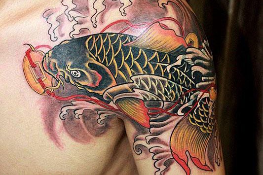 这款纹在侧肩的鲤鱼纹身,霸气侧露,鲤鱼口咬金钱,象征财运兴旺!