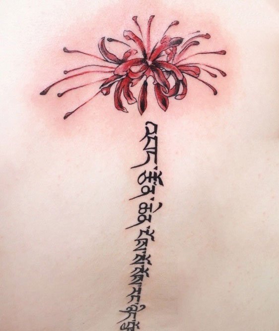 与象征吉祥的梵文相结合的彼岸花纹身,神秘中更带着对美好的祝福!
