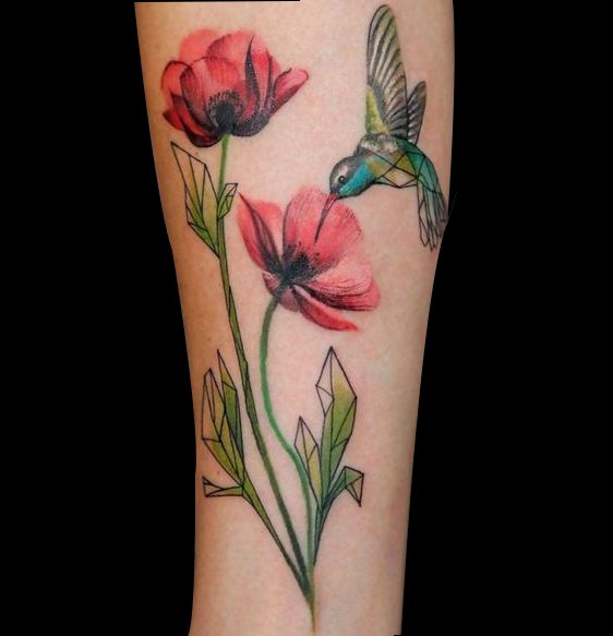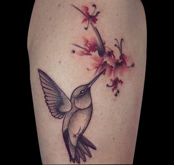 蜂鸟吸允着盛开的花蜜,画面十分的和谐有爱,这样的纹身不管男女都适合!