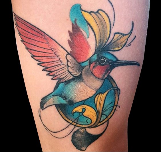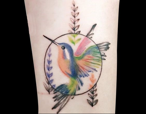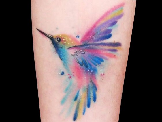 透过水彩风格的点缀,如彩虹般的蜂鸟纹身实在是惊艳,十分的清新美丽!