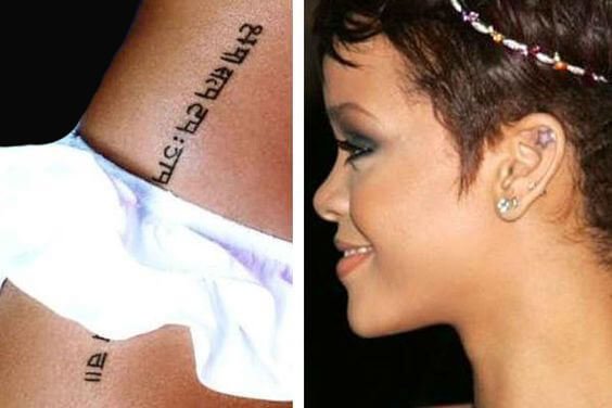 Rihanna的纹身一直都是刺青中的典范。她的梵文纹身从腰部延伸到臀部,译为宽恕、诚实、抑制,是勉励自己意思。这个神秘又独特的纹身,甚至一度掀起纹梵文纹身的热潮。