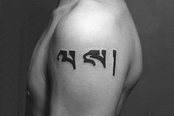 梵文纹身就这样简单的纹刺在男士大臂上,霸气、简洁,丝毫不输给图腾纹身呢!