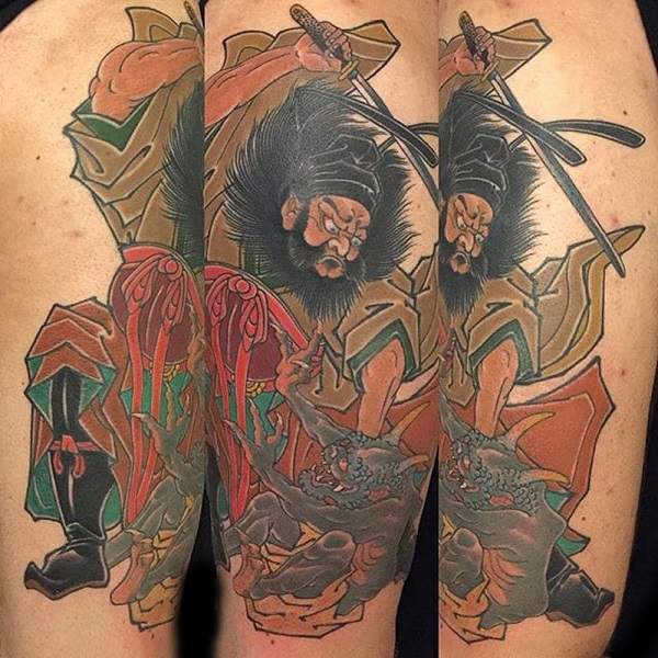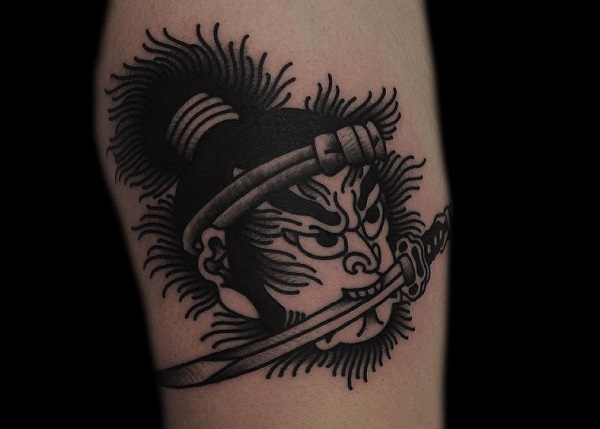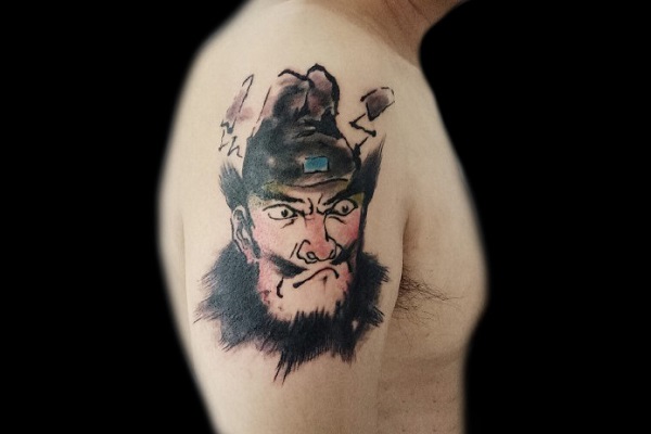 单独的钟馗头像,可以把脸部的细节纹绣的更加清晰,五官的精致打造和发饰的细节纹绣都体现纹身师的高超技艺。让表情更加生动形象。