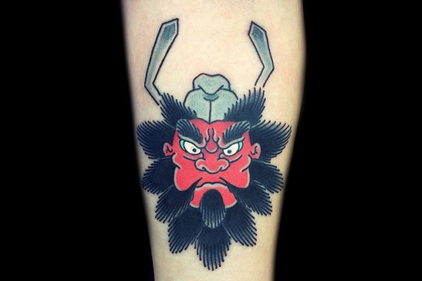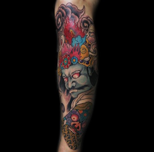 不趋于写实而是用象征,简洁的手法打造钟馗头像,像叶子的毛发,纯红的脸颊,中规中矩的帽子都是对钟馗的简化,纹在小臂不至于繁复却也细腻清晰。