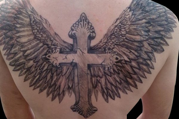 后背大面积的十字架翅膀纹身,在十字架的两侧加上向上延伸的翅膀,给人一种力量感,即使面对黑暗,也不会害怕!
