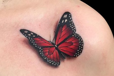 女生锁骨上的蝴蝶纹身,在纹身师的精雕细琢下,栩栩如生,十分精致。