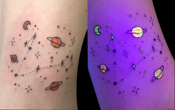 黑光纹身指的就是荧光纹身,在平常的光照下,基本是隐形的,很多人误以为,关了灯,纹身就会发光,这是错误的。