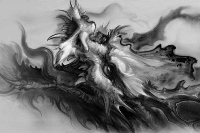 用传统的水墨方式来呈现经典的神话形象,中国韵味自然浓郁。龙张开的大嘴宣示着自己的凶猛,锋利的牙齿闪着寒光,眼神坚定,栩栩如生。