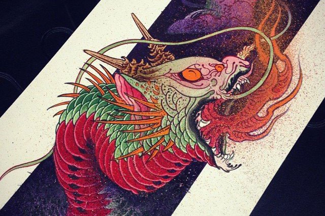龙的形态自由之中带着几分神圣的味道,用泼墨式纹身加以呈现,其筋骨更显不俗,在空中自由穿梭,潇洒自在。