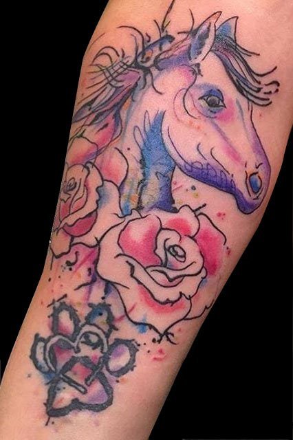 水彩玫瑰马纹身,玫瑰艳丽,骏马神气,多姿多彩。