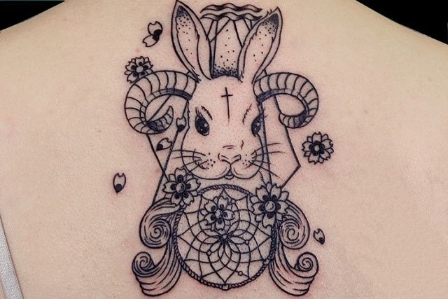 兔子羊角线条纹身,它们都是极具温情的属相,善于平息风波,缓解气氛。