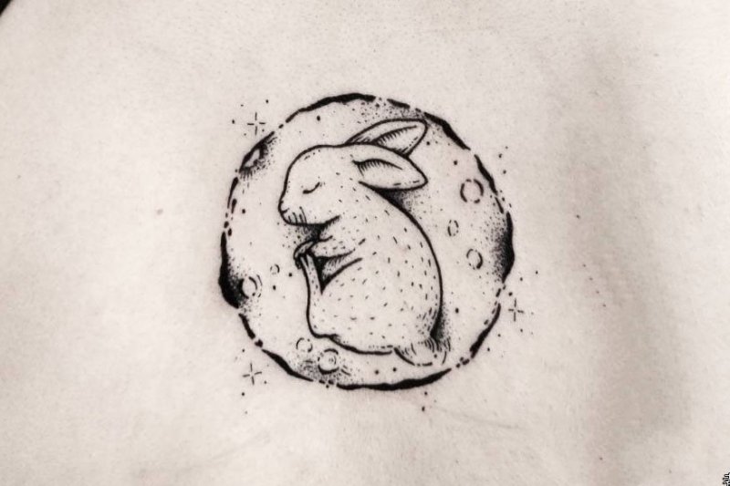 后背生肖兔纹身,兔是机敏和幸运的象征,兔子蹦跳着来报喜了。