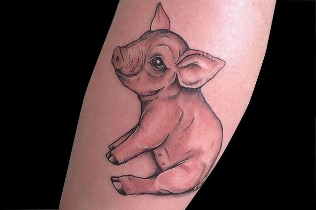 现实风格小猪纹身,猪肥硕健壮,是财富的代表。萌到你了吗?