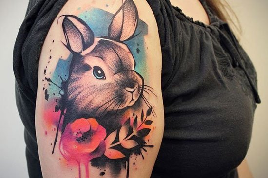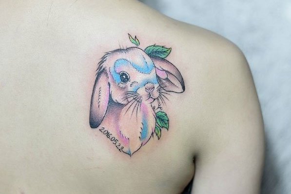 水彩兔子纹身,兔子带有积极乐观的寓意,它将共属羊人共享这份美好寓意。