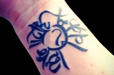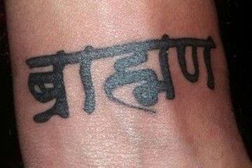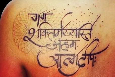 我们可以看到一个以创造性的方式刻画的圆形梵文纹身。它可以解读为“希望、勇气和信念”。这种纹身显示了一种充满活力的生活方式。