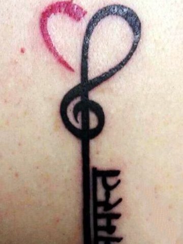 上面是一幅高音谱写的心形纹身,上面有一个问候语“NAMASTE”,意思是印地语中的“NAMASTE”和英语中的“你好”。它给人一种幸运的感觉。