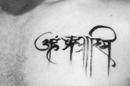 “Om”梵语纹身。OM是印度教的精神声音和神圣的象征。它也是印度教、佛教、耆那教和锡克教的颂歌。人们可以通过多次冥想或陶醉这一声音来深入研究博克教的思想,它是一个约束个人积极能量的结合术语。