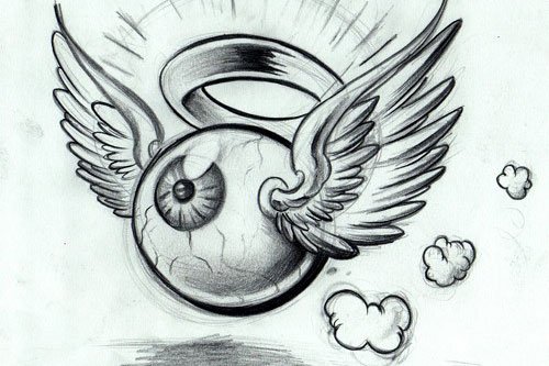 一款长着翅膀的Old school眼睛纹身手稿,头戴光环,用纯洁的眼睛去看待复杂的世界。
