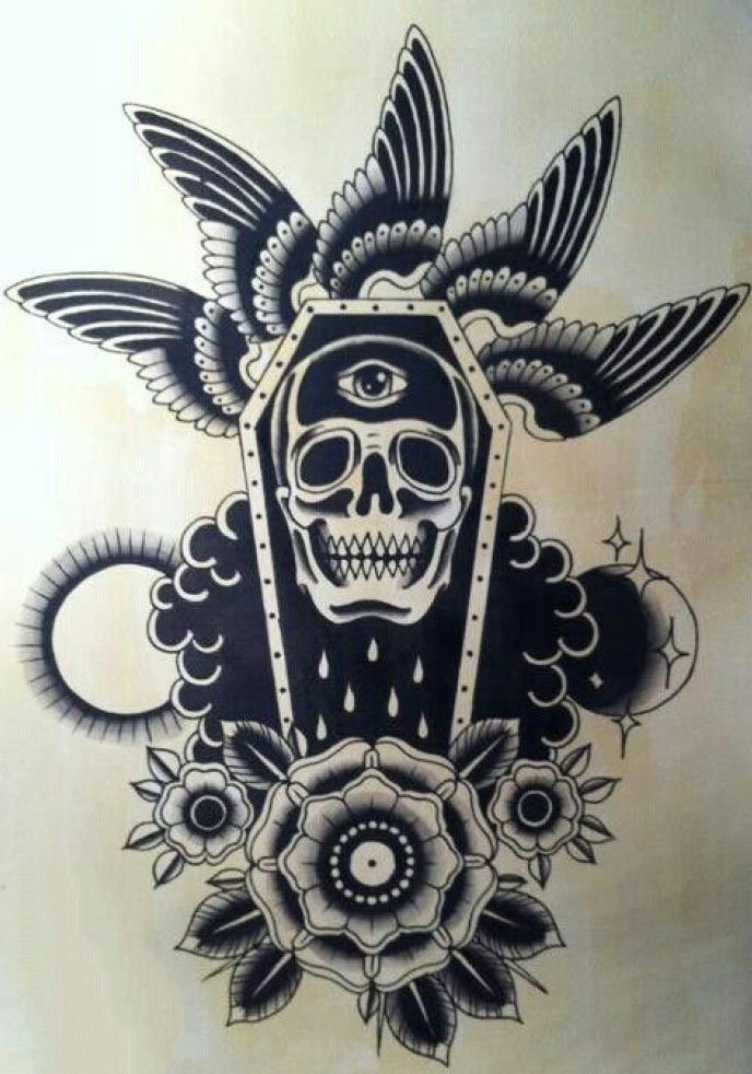 骷髅元素也是欧美十分热门经典的Old school图案元素,把死神纹在身上,表达对死神的尊重和信仰,希望得到死神的保佑。
