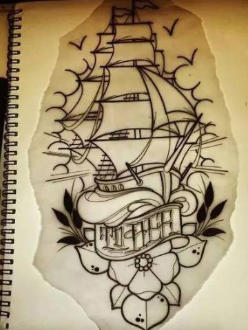 帆船纹身手稿图是Old school纹身手稿的经典元素,代表当时人们一往无前、富有冒险的精神。