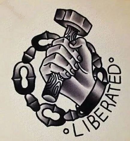这款拿着铁锥想要破除手腕上的镣铐的的Old school纹身手稿,体现当年欧美人们追求自由精神。