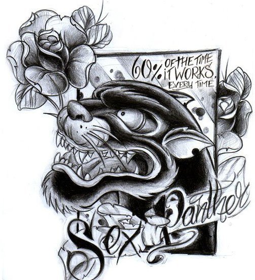 黑豹,代表着善战和力量,old school纹身手稿喜欢搭配玫瑰的元素,让黑豹手稿图看上去更令人着迷,色彩鲜明。